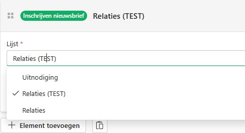 Maak eerst een testpagina aan voor het testen van de nieuwsbrief en voeg het nieuwe element Inschrijven nieuwsbrief toe.